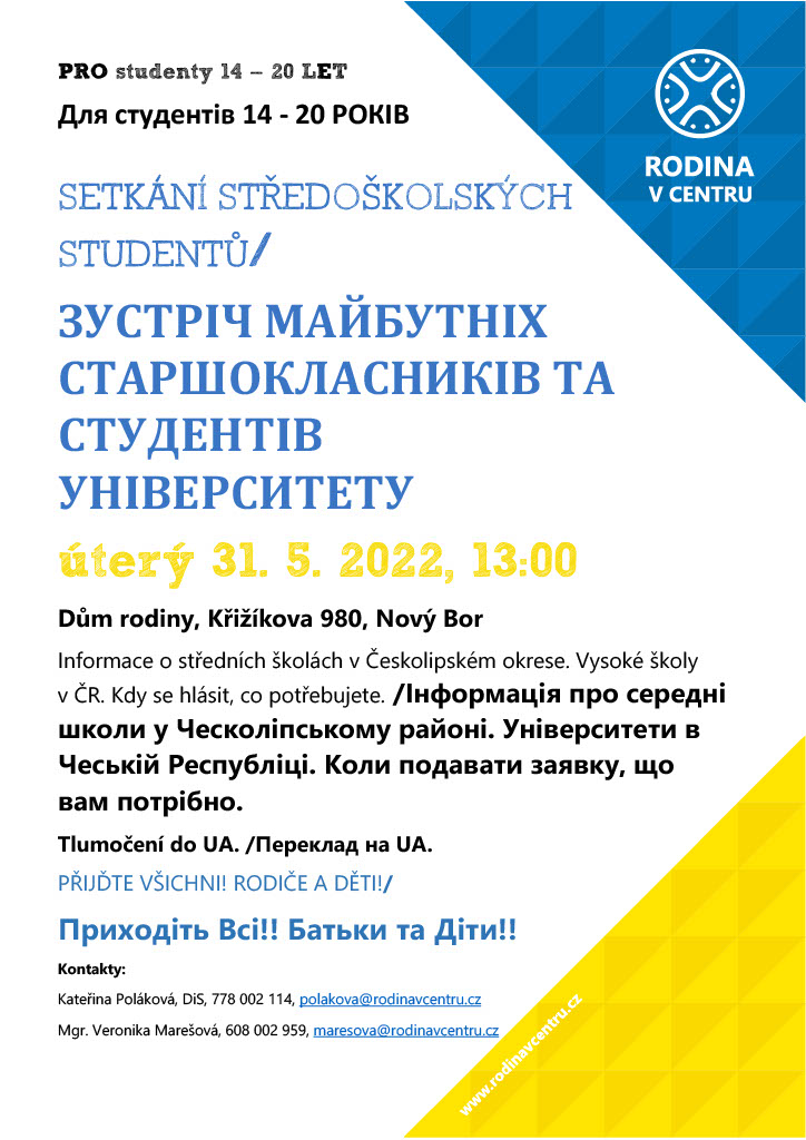 Setkání ukrajinských středoškolských studentů se bude konat v Domě rodiny 31. května. Je určené všem, kteří v září nastoupí u nás ke středoškolskému či jinému vzdělávání. Naše odborné poradkyně z programu Inkluze II mají připravené všechny potřebné informace o nabídce škol na Českolipsku, co studenti potřebují, jak a kdy se hlásit. Poskytnou i přehled o vysokých školách v České republ