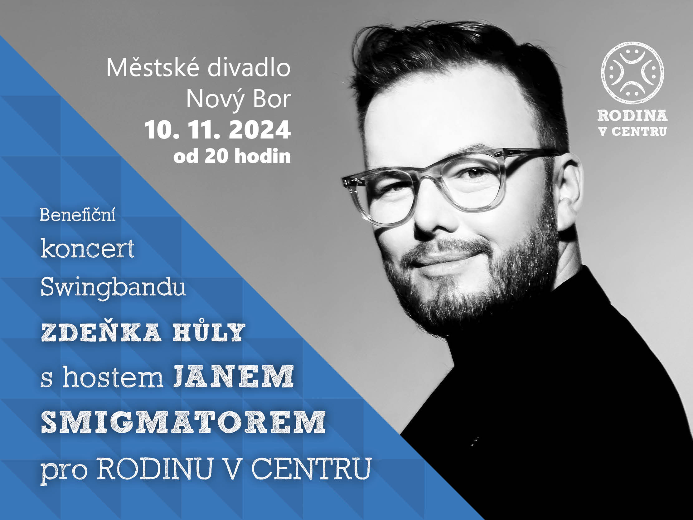 Srdečně zveme všechny příznivce dobré hudby a Rodiny v centru na „Benefiční koncert Swingbandu Zdeňka Hůly s hostem Janem Smigmatorem„, který se uskuteční 10.11.2024 v prostorách Městského divadla Nový Bor od 20 hodin. Výtěžek z koncertu poputuje na nákup vybavení do nových prostor Mateřského centra Koblížek. Vstupenky jsou ke koupi zde: DISdata – tickets