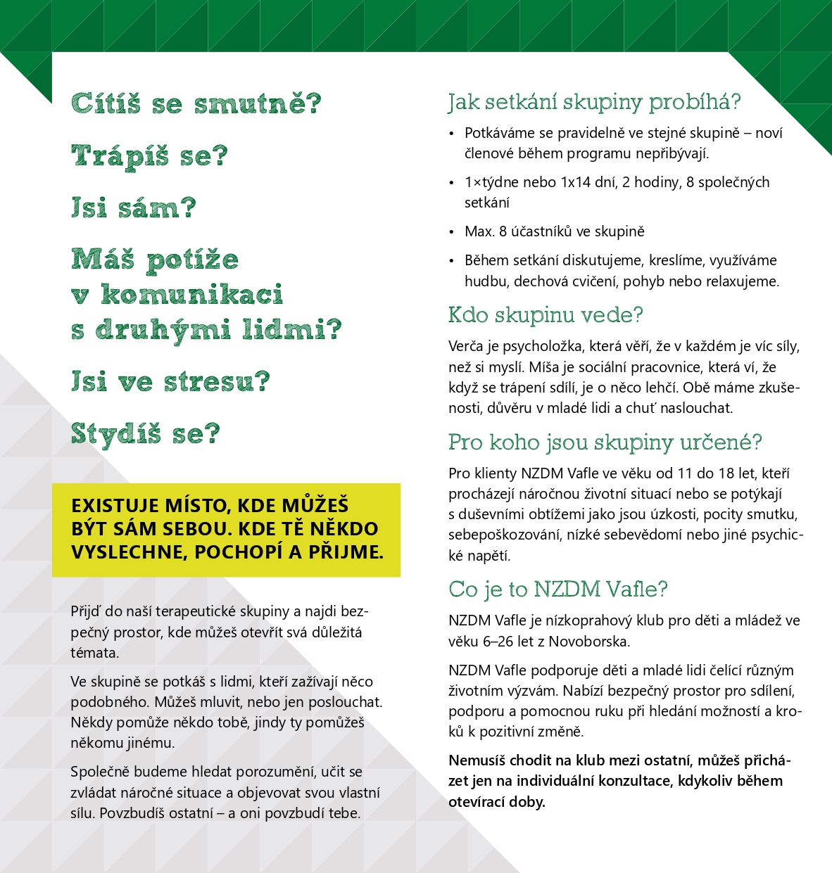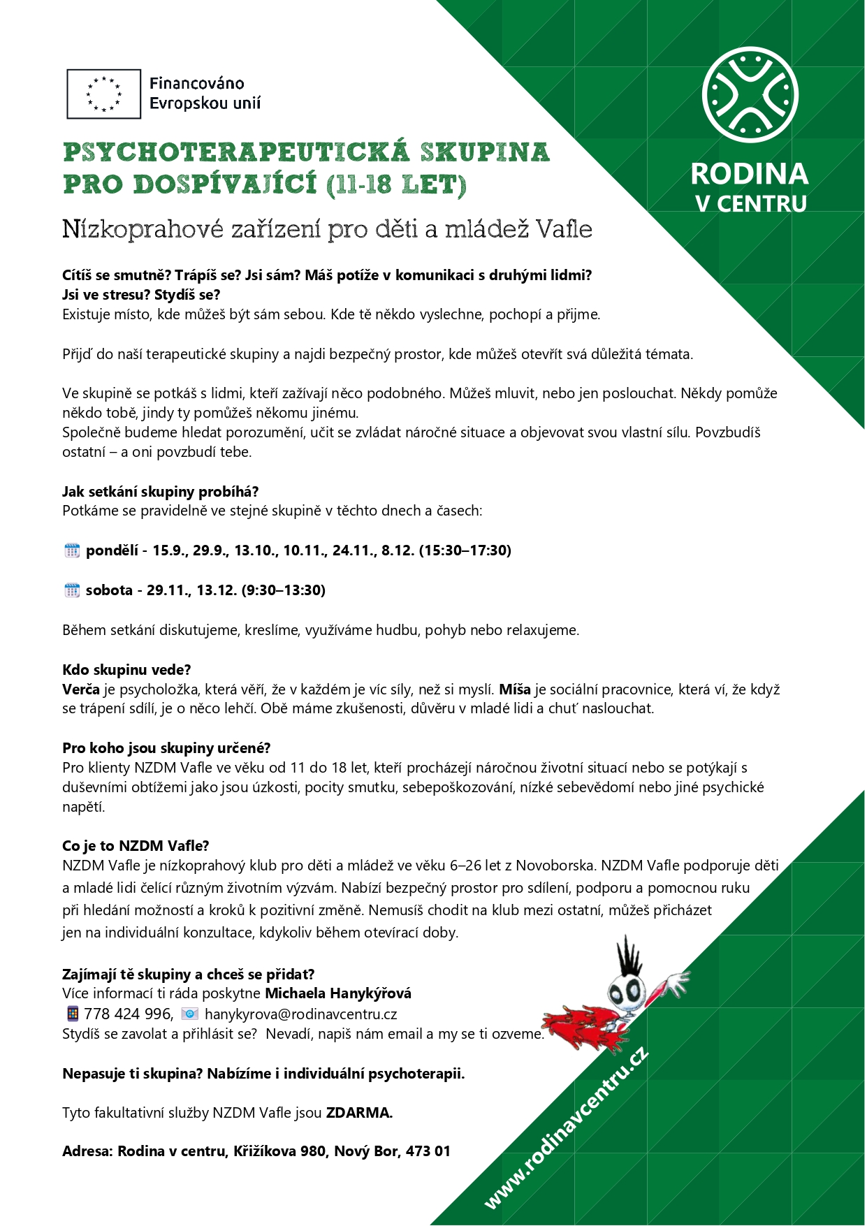 Služby probíhají v rámci projektu „S rodinou proti vyloučení“ (OPZ+) na období únor 2025 – leden 2028 a jsou pro klienty zcela zdarma. Podmínkou účasti je vazba na Nový Bor (škola, trvalé bydliště, spolupráce s úřady apod.) a skutečnost, že zájemce je klientem NZDM Vafle (pokud jím ještě není, může se jím stát).